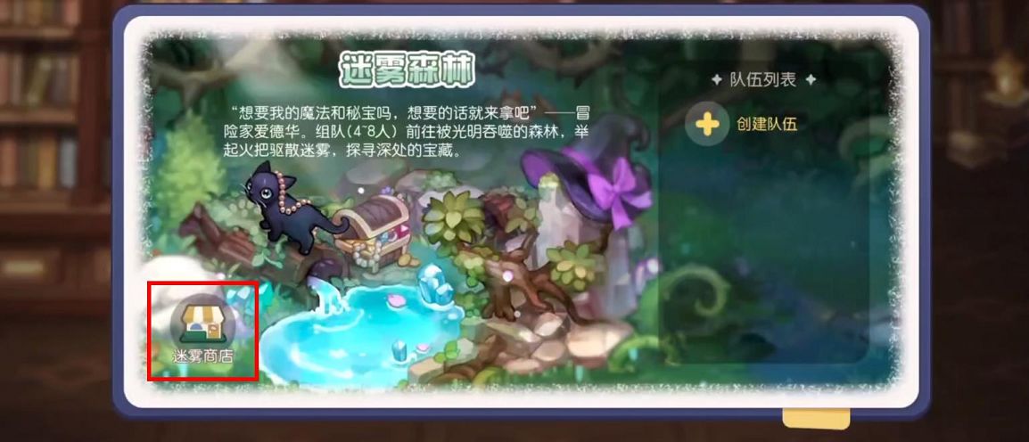 而在这个界面上就能找到一个【迷雾森林】的玩法,它是一个限时玩法,只有在每天十九点到二十三点五十九分期间开放,小伙伴们点击这个【迷雾森林】,就能来到其界面,然后在左下方的位置处就能找到【迷雾商店】了。