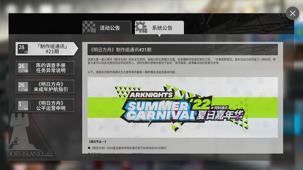 2022夏日嘉年华活动特别通讯目前定在了8月6日晚上八点举行,也就是本周六晚。想获得一手消息的小伙伴注意蹲守哦。官方公布将介绍夏日嘉年华的全系列活动内容和玩法,以及全新的SideStory,最新的限定寻访玩法和后续会更新的内容。