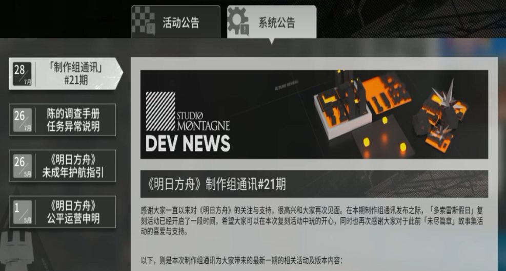 此次制作组通讯就像是一个预热通知,所有上线玩家均能在公告-系统公告里收到这条信息。这也是玩家获取游戏后续进度、和官方交流讨论获取福利、以及共同维护游戏后续发展的座谈会。有时间的小伙伴可留意最新消息哦。