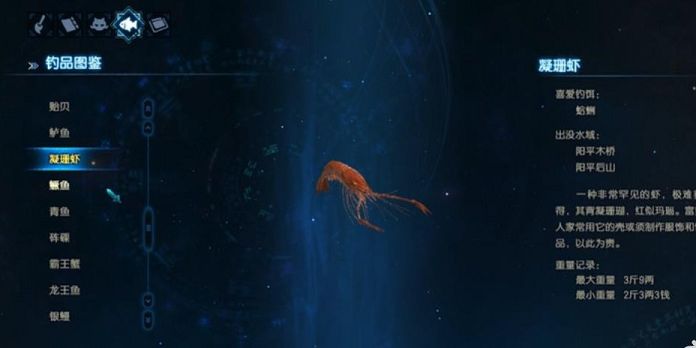 贻贝喜爱普通钓饵、蛤蜊和河虾,出没在得桐水洼、阳平木桥、林中瀑地和冰晶湖。鲈鱼喜爱普通钓饵、蛤蜊和鲫鱼,出没于林中瀑地和阳平断桥。凝珊虾喜爱蛤蜊,出没于阳平后山。