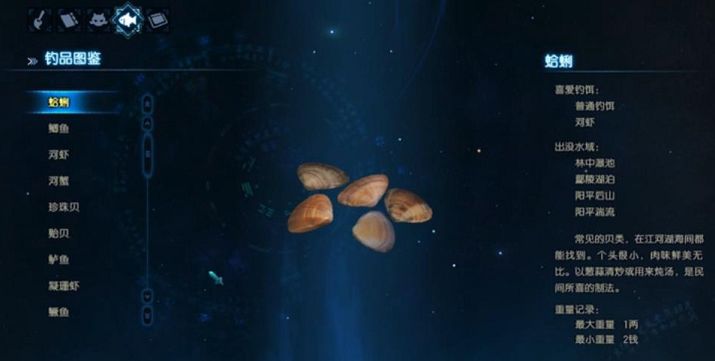蛤蜊喜爱普通钓饵和河虾,出没在林中瀑地、鄢陵湖泊、阳平后山和阳平湍流。鲫鱼喜欢普通钓饵,出没在栖霞小池和栖霞湖水。河虾喜爱普通钓饵,出没于栖霞湖水。河蟹喜爱河虾,出没在栖霞湖水。珍珠贝喜爱河虾和贻贝,出没在冰晶湖和光明野清池。