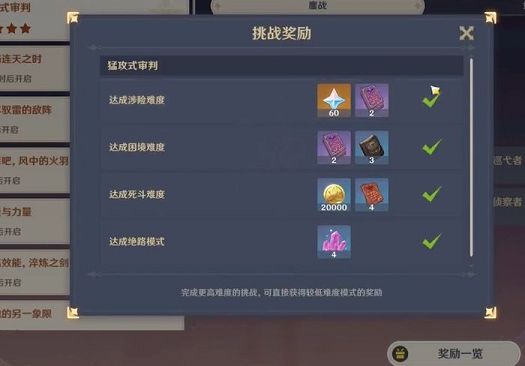 第三天的难度为三星,出现的怪物属性为水火冰风,在鏖战中他的规则限制是玩家必须在三分钟之内解决战斗,同时还要打出二十次关于雷属性的反应,比如感电、超导等等,最后击败三个首领即可成功,因为这些怪物本身是没有雷属性的,而想要完成第二个条件,就只能自己带一个雷属性角色了,然后全部击败即可快速过关,大家可以使用刻琴来完成这个任务,因为她的大招伤害为AOE,可以很快让雷反应吃到每一个怪物的身上,所以还是比较不错的,绝路也是一样如此。玩家们每完成一天的鏖战,都可以领取到六十原石以及一些奖励,当完成了绝路挑战后还可以拿到四个三级强化水晶。因为目前只开了三个挑战,所以小编只能向大家讲述他们的过关方法,等后续全部开启后,会给大家全部补齐,希望大家在看完后都可以轻松完成这次挑战哦。