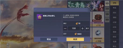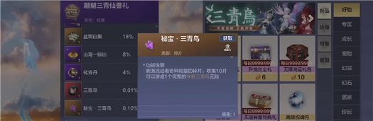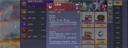 目前,三青鸟有两种获取方式,其中一种就是购买【翩翩三青仙兽礼】,玩家购买一个礼盒就需要花费18婴玉,而打开礼盒并不是百分百获得三青鸟的。