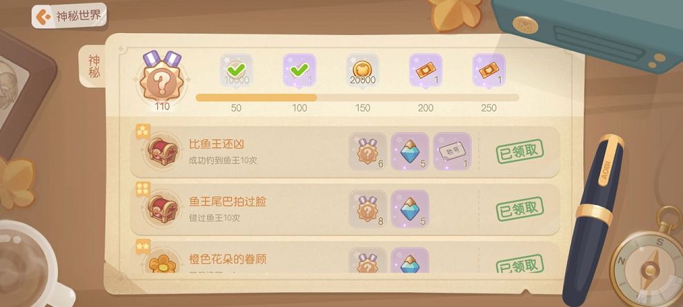 这个成就和钓鱼就息息相关了,小伙伴们只要钓上来十次鱼王,就又能收获一个新成就了。当然,游戏里能钓鱼的地方是比较多的,在叮咚小溪的上中下游都是能钓鱼的哦。