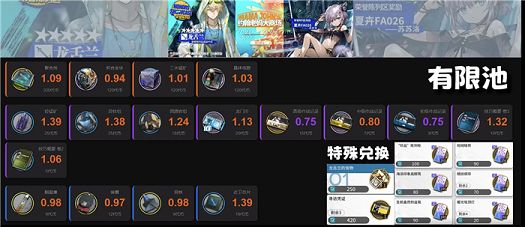 由于此次活动不同以往,关卡不会直接掉落材料,而是以不同方式掉落、换取活动代币,去商店的无限奖池中兑换材料,其中性价比高的无限材料包括紫薯、蓝铁、蓝土。