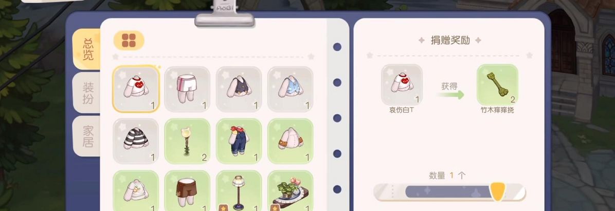 至于捐赠的物品选择,这个自然就要看小伙伴们自己了,如果抽到了一些相同的物品道具,其实都是能够拿去捐赠的,而捐赠之后自己也会得到一个痒痒挠的奖励,只要凑够五十个,就能立即前往小耶的服装店去抽盲盒啦。
