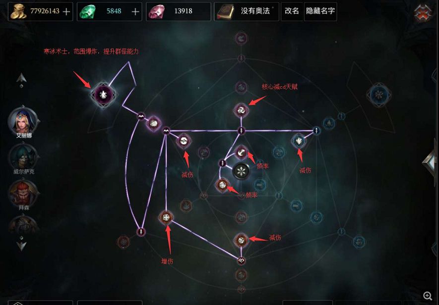 天赋的话,建议小伙伴们优先选择减冷却的,同时左边的寒冰术士也是需要优先的,其他的话可以选择减伤、增伤以及频率等,可以参考如下: