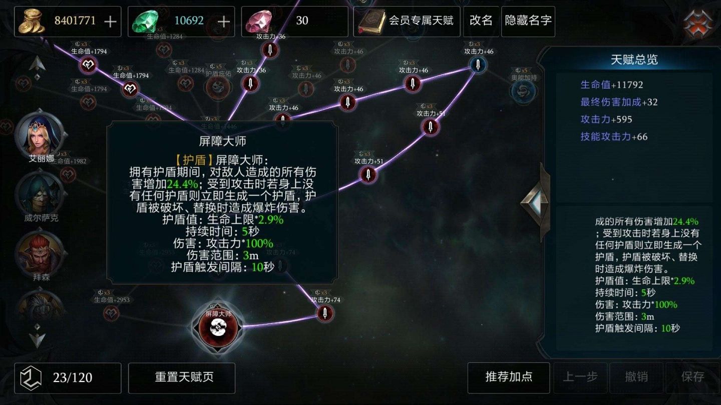 此外,小伙伴们在自身等级越来越高的时候,就能去尝试其他的更强流派了,此时建议优先选择屏障大师,它能提升一定比例的全部伤害,而条件是非常简单的,只需要有护盾就行,堪称一个实用性非常高的天赋了,同时也能提供一定的护盾保护。