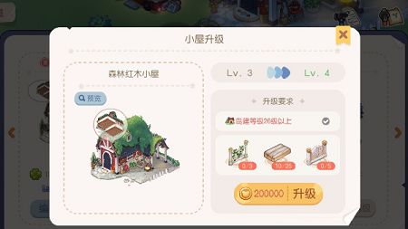 在游戏中我们去完成一些相应的任务也可以获得等级上限更高的房子。但是这些房子升级也是需要我们达成相应的条件才能够升级。比如森林红木小屋,这个小屋就需要我们的小岛等级到达26级以上才能开始升级小屋,而且升级还需要材料以及金币,当然相应的外观以及属性自然是有着质的提升。