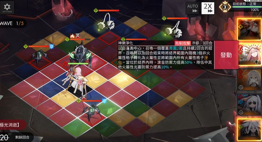 先看技能,1技能神乐净化,2个回合9转,虽然数量可观,但效率不算高,而且不稳定。因为转色效率不高,搭配像是火队小短腿需要秒人的阵容来说,就显得有点格格不入了。但在搭配满破的乌列尔时,因为对方也有着很强的专色能力,所以凛音转色延迟的特点在这里就得到了很好的弥补,可以提升二段输出。