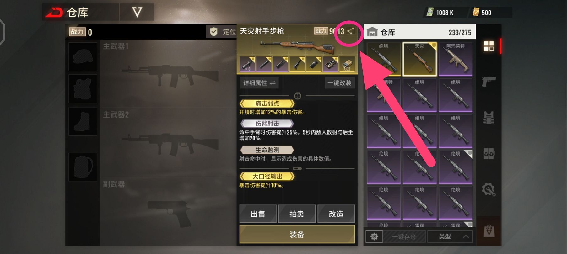 此外,在局外的时候,小伙伴们同样是能够将自己的一些高级装备分享给好友的,其具体的操作就是,先去仓库里面找到装备,选中某个装备,在其详情的右上方位置就能看到一个小小的“分享”图标,也就是在战力的右边,点击这个分享的图标,就能直接将其分享到好友频道上。
