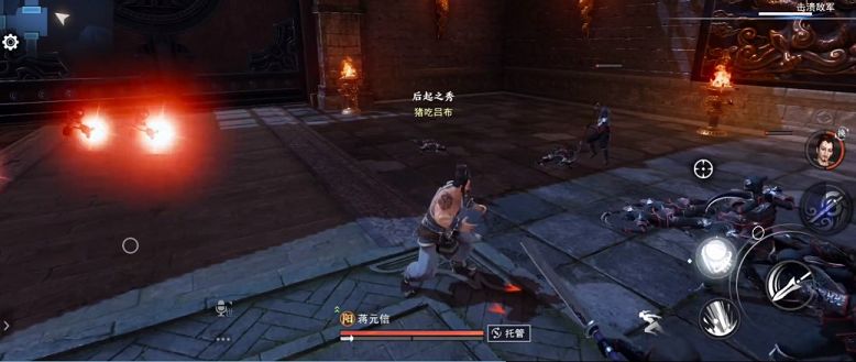 二战技:该战技有两段,第一段快速拔拳向前方打出一道拳劲,再次点击可以触发第二段,此时蒋元信会猛扎马步释放一道圆柱形的护体罡气向周围扩散,对敌人造成恐惧效果。