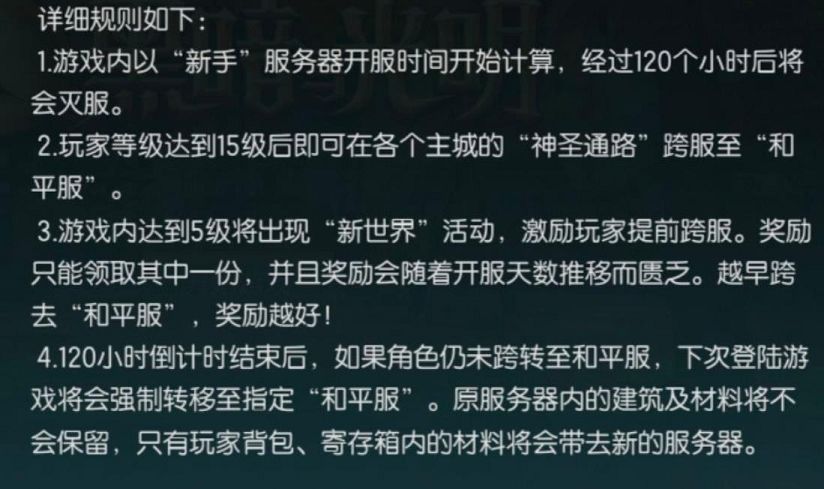此外也需要提醒一下,即使小伙伴们一直不移服的话,也是不能一直呆在新手服的,只要在新手服呆满一百二十小时,就会自动进入灭服状态,下一次再上线的话就会自动转到和平服。