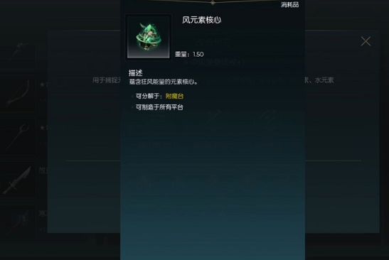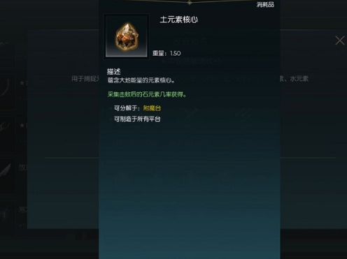 暗元素核心(击败暗元素魔物可以获得,切割黑魇石也可以获取)、风元素核心(击败风元素魔物可以获得,汲取灵力也可以获取)、土元素核心(击败土元素魔物可以获得,切割金精矿也可以获取)。