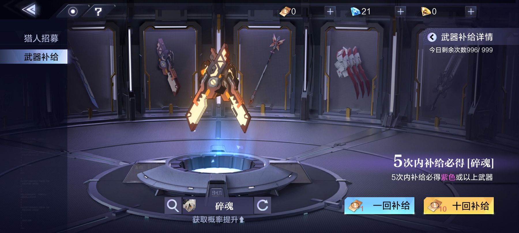 1. 招募-武器补给,选择心愿武器,只需要完成30次抽奖玩家就会必得碎魂这把武器。