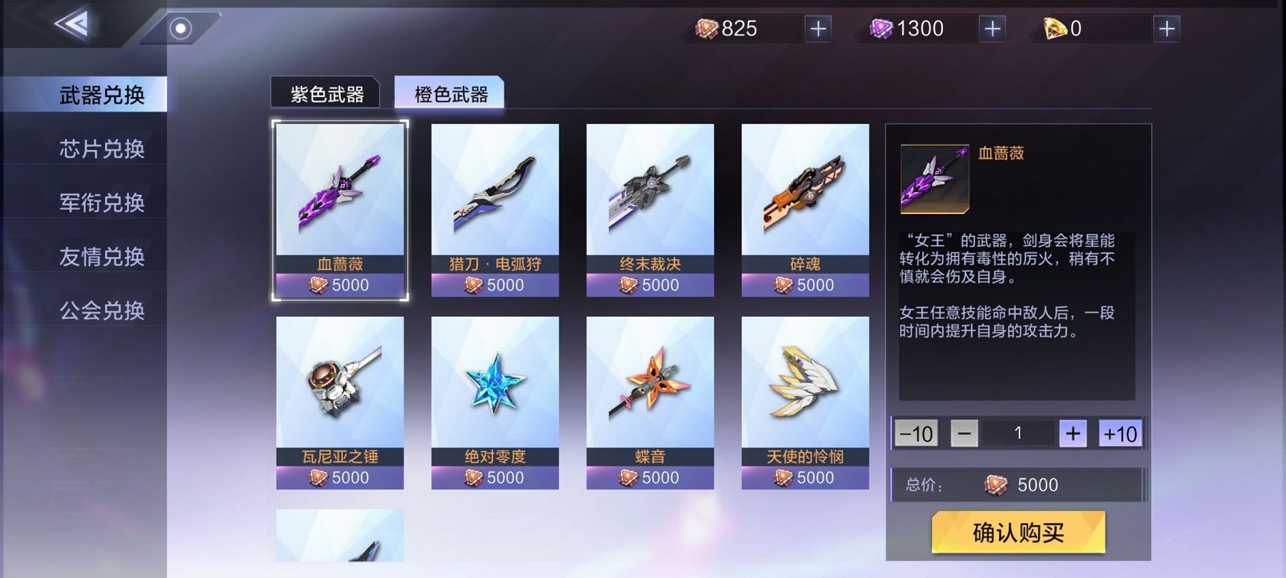 玩家可以进入兑换商店,使用获取的对应的武器零件来兑换自己想要的紫色武器或橙色武器,武器零件获取方式如下:参与融核体入侵活动获取、无限试炼玩法、武器分解。需要注意的是玩家虽然能够在这里兑换各种武器,但是无法在这里兑换S阶猎人的专属橙色武器,S阶猎人的武器还是需要进行抽取才能获得的。