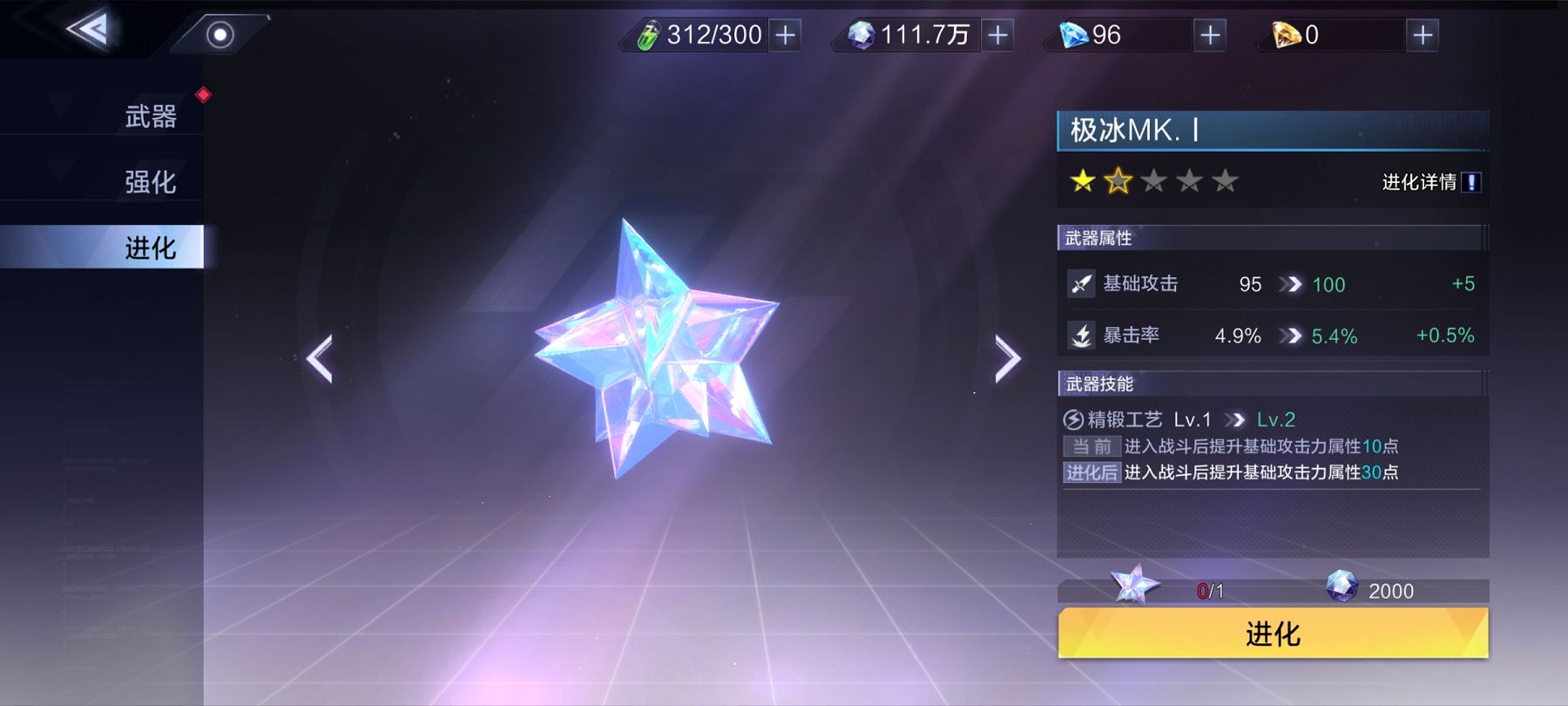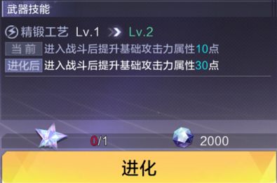 武器进化:武器进化时能够直接提升武器技能BUFF的,但是需要耗费大量的武器才能将武器提升到满星,同时考虑到该品质武器的获取难度问题,大量武器消耗对于蓝色武器来其实可以忽略不计了。