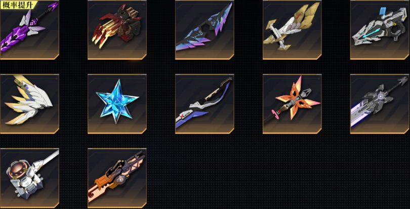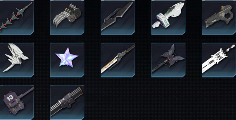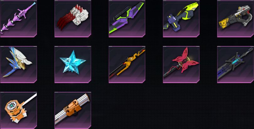 制式链刃-女王专属、仿古钢爪-狼人专属、制式手里剑-影舞者专属、制式臂铠-龙灵专属、制式机枪-机械师专属、浮游兵装·α-圣女专属、疾冰MK.Ⅰ-冰魄专属、制式长刀-斩魂专属、法杖-序曲-异能者专属、制式重剑-审判者专属、制式重锤-猫女专属、制式刃爪-狼刃专属