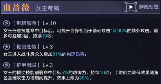 女王任意技能命中目标后,可提升自身相当于基础攻击6.75%-18.90%的额外攻击,最多可叠加3层,持续10秒;