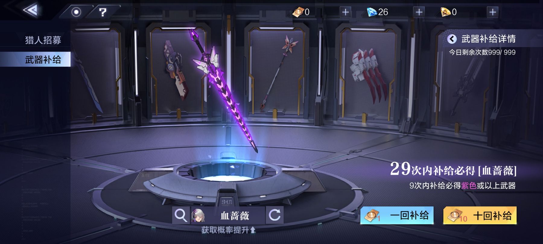 武器补给:该补给是给S级猎人专门提供专属武器的渠道,需要玩家使用补给券或钻石进行抽取,只要选择心愿,抽取次数达到30次即可获得玩家想要的武器,在这里不仅能够获取金色武器,还有概率获取紫色、蓝色品质的武器,也是玩家获取武器零件的一个地方。