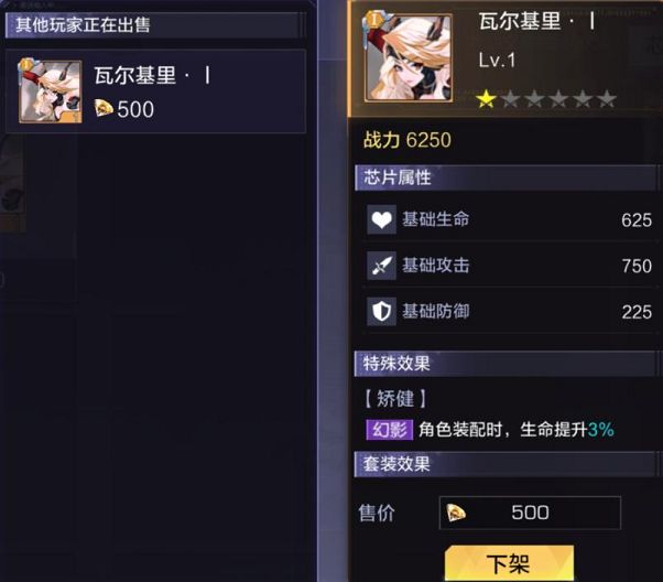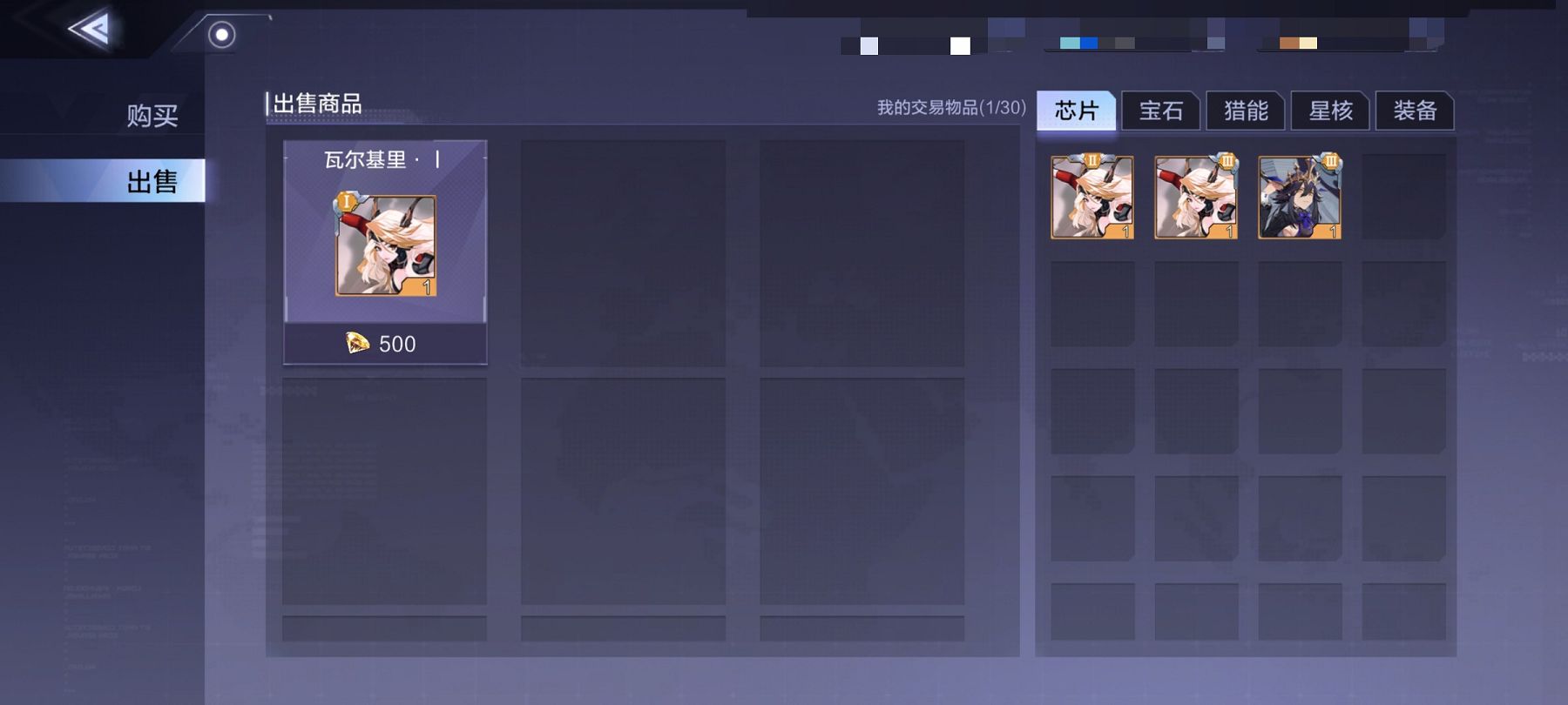 进入出售系统时中间会显示玩家当前正在出售的商品,若是没有出售,可以点击该商品进行下架处理,右边显示的则是玩家背包可出售的所有道具,芯片、宝石、猎能、星核、装备。