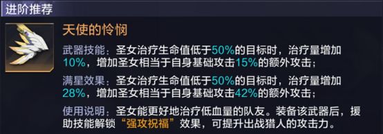 装备1/5/精英3专武时,释放圣女援助技能将提升出战猎人相当于圣女攻击5%/10%/15%的额外攻击力,持续10秒;