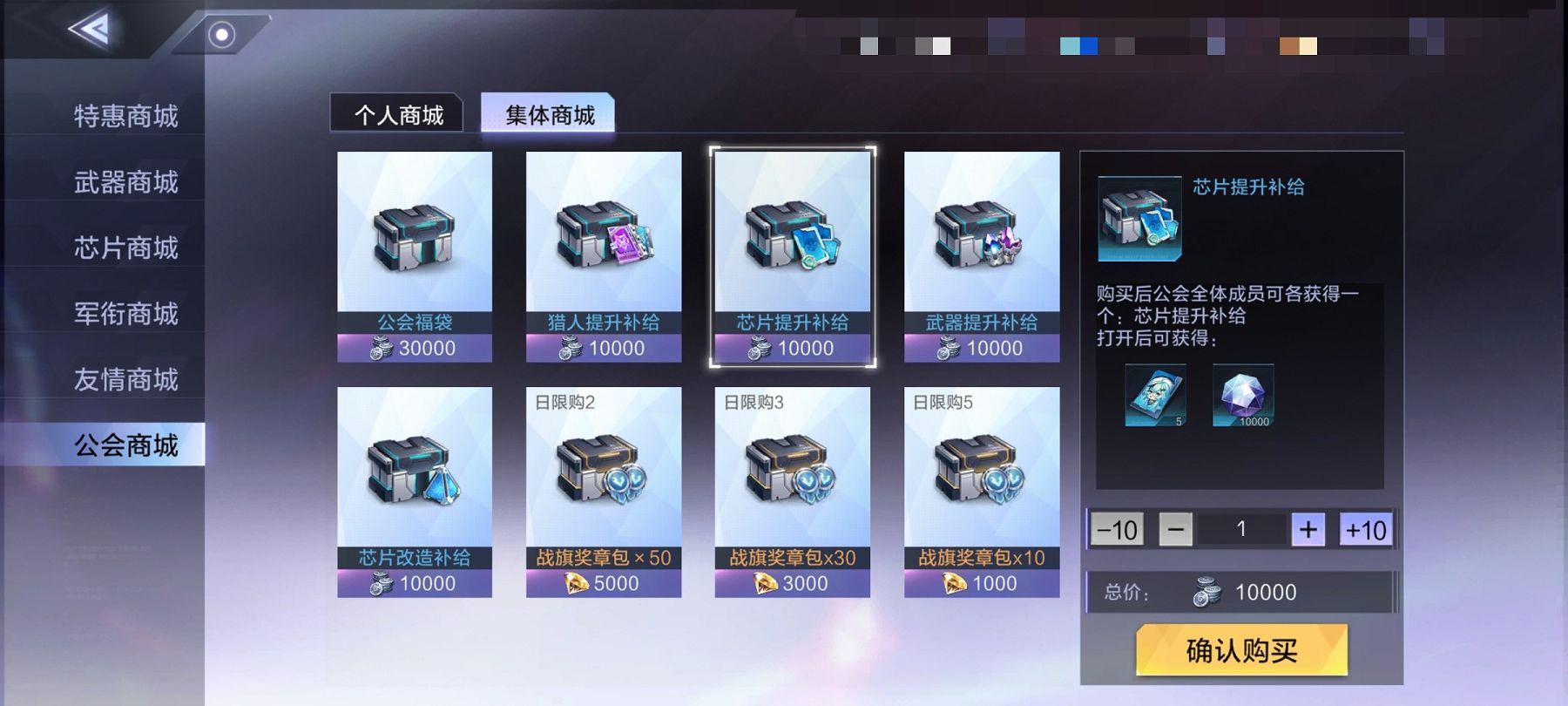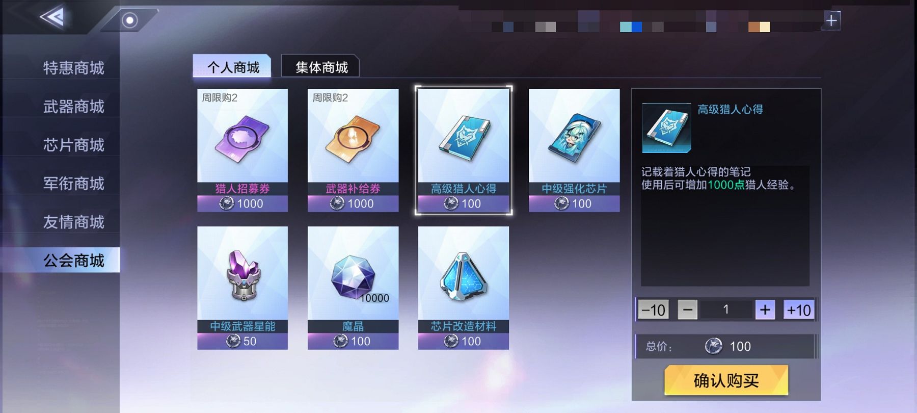 公会商城有个人商城与集体商城两种,个人商城只提供给自己购买,集体商城则是全体公会成员都能购买的道具,商城商品如下: