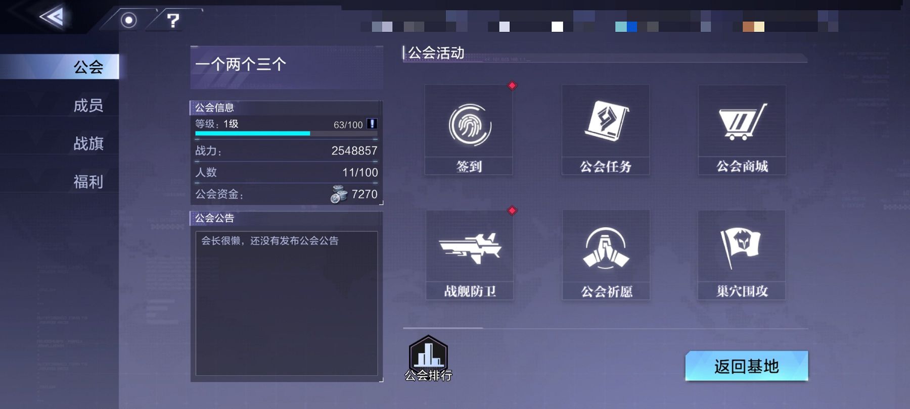 进入公会系统能够直接进行签到、工会任务、进入公会商场、战舰防卫、公会祈愿、巢穴围攻留个快捷操作选项。