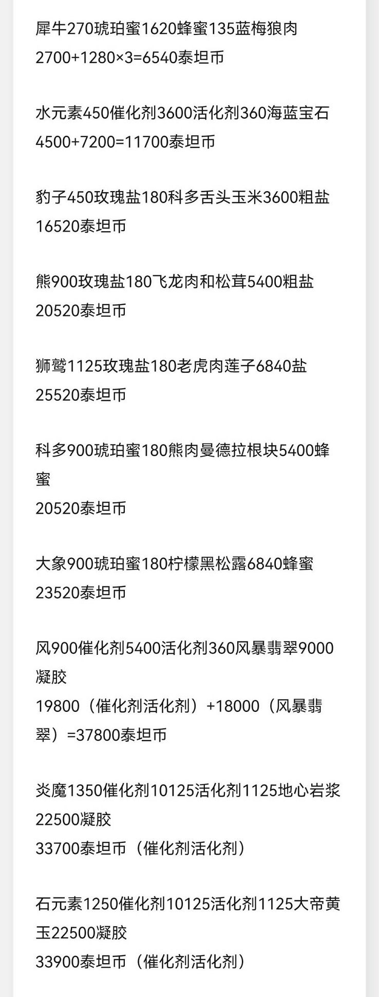 比如,小伙伴们想要得到一只完美犀牛的话,就需要收集琥珀蜜、蜂蜜以及蓝梅狼肉这三种材料;想要一只完美豹的话,则需要收集玫瑰盐、科多舌头玉米以及粗盐这三者;而想要完美狮鹫的话,则需要准备玫瑰盐、飞龙肉、松茸以及粗盐这四种材料哦。