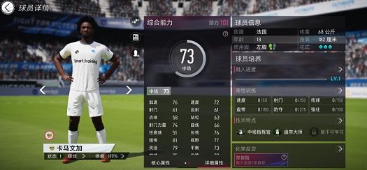 第三个为大家带来的就是来自法国的卡马文加,卡马文加的综合能力为101点,中场能力为73点。加速属性为76点、速度为72点、射门为61点、传球能力为78点。值得注意的是,卡马文加的年龄为18点,而且是惯用的是左脚。卡马文加这个角色的初始强度虽然不高,但是培养的难度比较低而且潜力比较大,中后期可以作为主力培养。