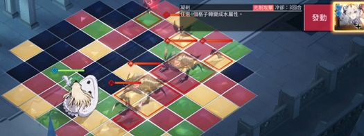 其主动技能凝刹能够任意选择全图范围内的四个格子并且将其转化为水属性格子,主动技能本身没有输出效果,但是能够转化属性的能力还有带有相当不错的辅助效果的。连锁技能极光的冷刃能够对范围内的敌人造成至少150%攻击力的伤害,最少的攻击范围是菱形12格,这个攻击范围还是相当大的。