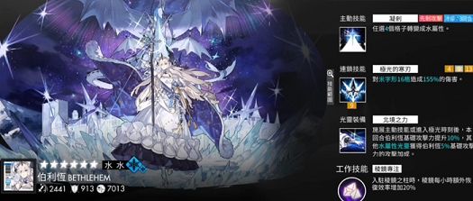 伯利恒这个角色刚推出的时候强度还是比较大的,但是随着游戏版本的更新也是被逐步削弱了,但是伯利恒作为一个带有转化能力的辅助角色来说能够定制转化四格的能力还是非常强劲的,拥有非常不错的转化效率,对于水队的提升也是非常明显。推荐给想要组建水队的小伙伴进行抽取使用。