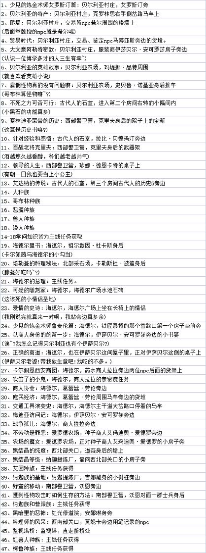至于游戏中的知识是在哪里获得的,就看以下列表吧,基本每个知识点都能在列表中找到。