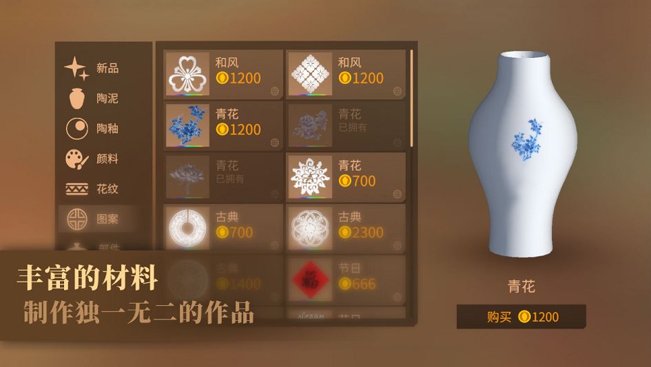 该游戏以娱乐性的方式呈现了制陶过程中的拉胚、烧制、彩绘、上釉等基本工序,每个工序都有不同的测试。本游戏是以传统陶瓷制作为基础,让您在游戏中感受到中华传统陶瓷文化的魅力!