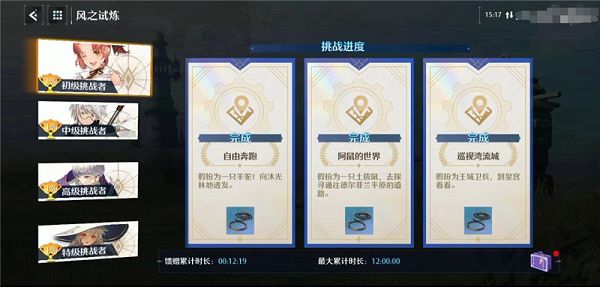 风之试炼根绝奖励的不同分为10个挑战难度,分别为:1、初级挑战;2、中级挑战者;3、高级挑战者;4、特级挑战者;5、大师级挑战者;6、宗师级挑战者;7、初级挑战家;8、中级挑战家;9、高级挑战家;10、特级挑战家。