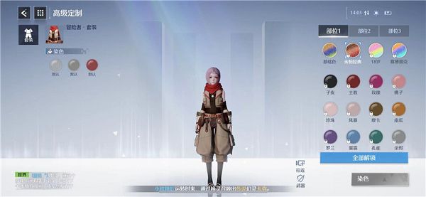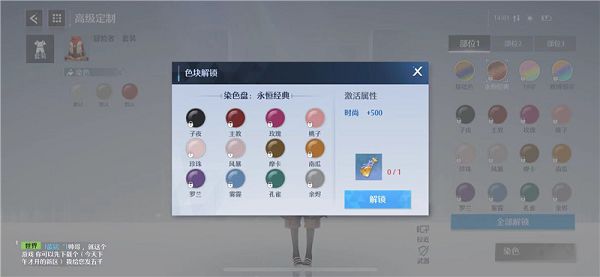 对时装的每个部位选择不一样的颜色进行染色就然后点击确认即可获得染色后的时装了。不过染色的颜色类型是需要解锁的,解锁需要相应的染色盘,比如永恒经典颜色需要永恒经典染色盘道具才可以解锁,18岁需要18岁染色盘道具才可以解锁,赛博朋克需要赛博朋克染色盘道具才可以解锁。解锁之后就可以使用该染色盘中12种不同的颜色了。