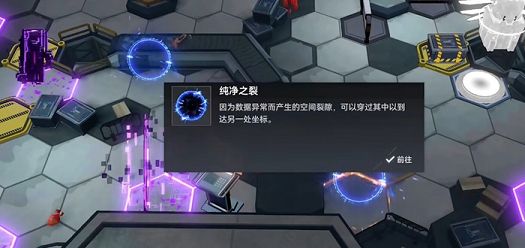 进入场景之后下方有一个纯净之裂(传送阵),直接进去,会传送到左上方的封闭空间。这里可以看到上方有四个乱流之隙,我们仅需要触发右侧的这个乱流之隙就可以了,打了之后可以获得第一个宝箱,右侧有一个纯净之裂先不要触发。我们从左侧绕路到下方,这里有一个防盗电磁网的开关,直接将其关闭,旁边有一个多功能钥匙,直接拿上。拿上之后前往左侧的操作台,互动之后从刚才看到的传送门那里出去。
