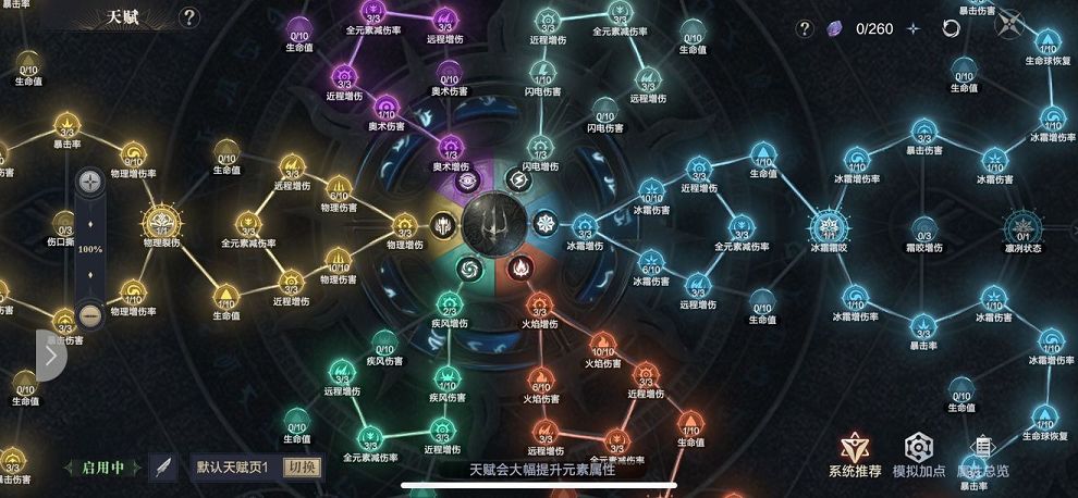 首先在天赋中一个有六种,分别是冰系天赋、火系天赋、风系天赋、物理天赋、雷系天赋、奥术天赋,作为一个擅长游走的职业,自然是需要控制技能来干扰对手的,所以天赋就选择冰系,在冰系中,优先加战技二,其余的天赋点全部均匀分配在每个战技上。