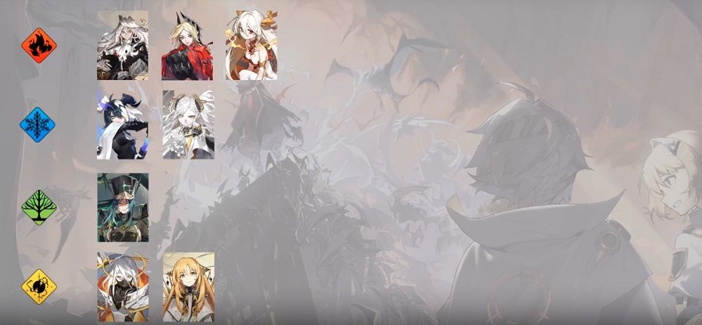 所以一个合格的初始号至少得有2只或以上同属性的角色。火属卡戎、维托利亚、乌列尔。水属性希罗娜与卡莲。森属性弥加德。雷属性的米迦勒与伊伦汀。