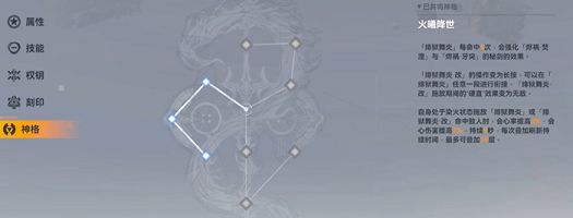 龙切的神格其实非常好搭配,我们无脑使用左系神格就可以了,游戏中的神格按照位置分为左、中、右三个派系,每一个派系都有三个神格天赋,共计九个神格天赋。第一个需要点亮的是龙切火曦降世,在龙切自身处于染火状态的时候释放绯狱舞炎系列技能并且成功命中敌人之后可以提升自身3%的会心率以及7%的会心伤害,这个效果能够持续9秒并且最多可以叠加十层。
