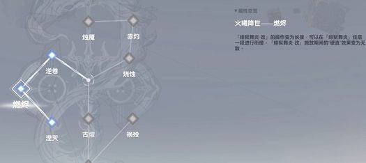 第二个推荐使用的是燃烬这个神格,装备燃烬之后能够将绯狱舞炎改这个技能从点击变为可蓄力长按,在长按期间可以配合绯狱舞炎这个技能提供衔接效果,而且让大家在释放绯狱舞炎改的期间获得无敌效果。