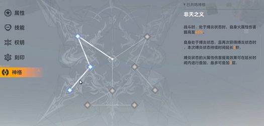 最后就是非天之义了,第一个神格叫做否天,成功突破一次之后解锁,在战斗时阿修罗进入缚炎状态之后能够将自身的火属性伤害提升到45%,后面两个神格无酒以及界破都可以对缚炎状态的持续时间以及火焰加成效果持续时间进行延长,可以说非天之义是阿修罗在获取专武之前最适合的神格体系了。