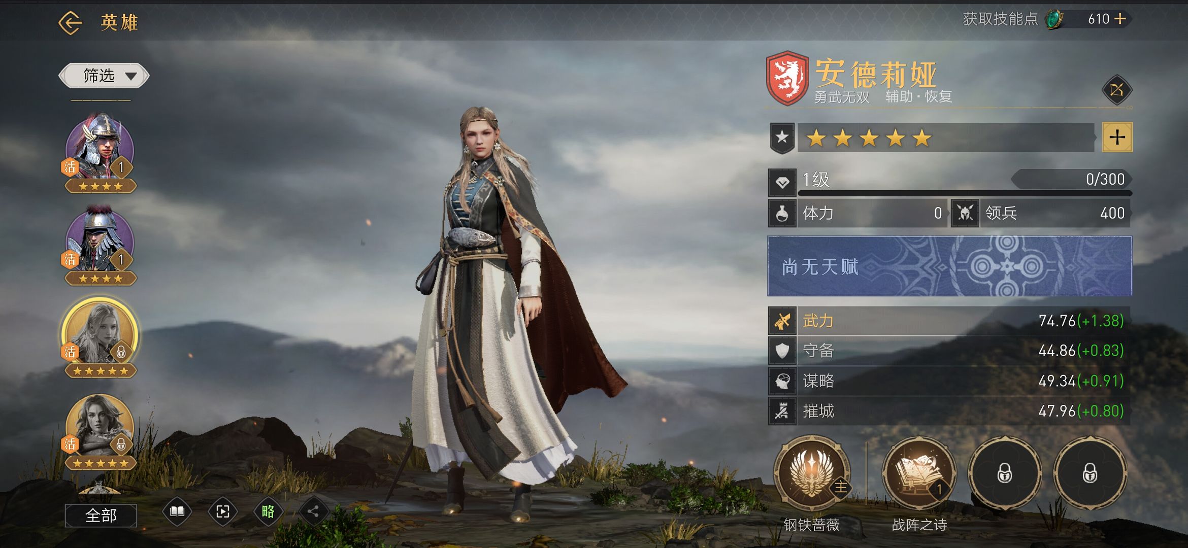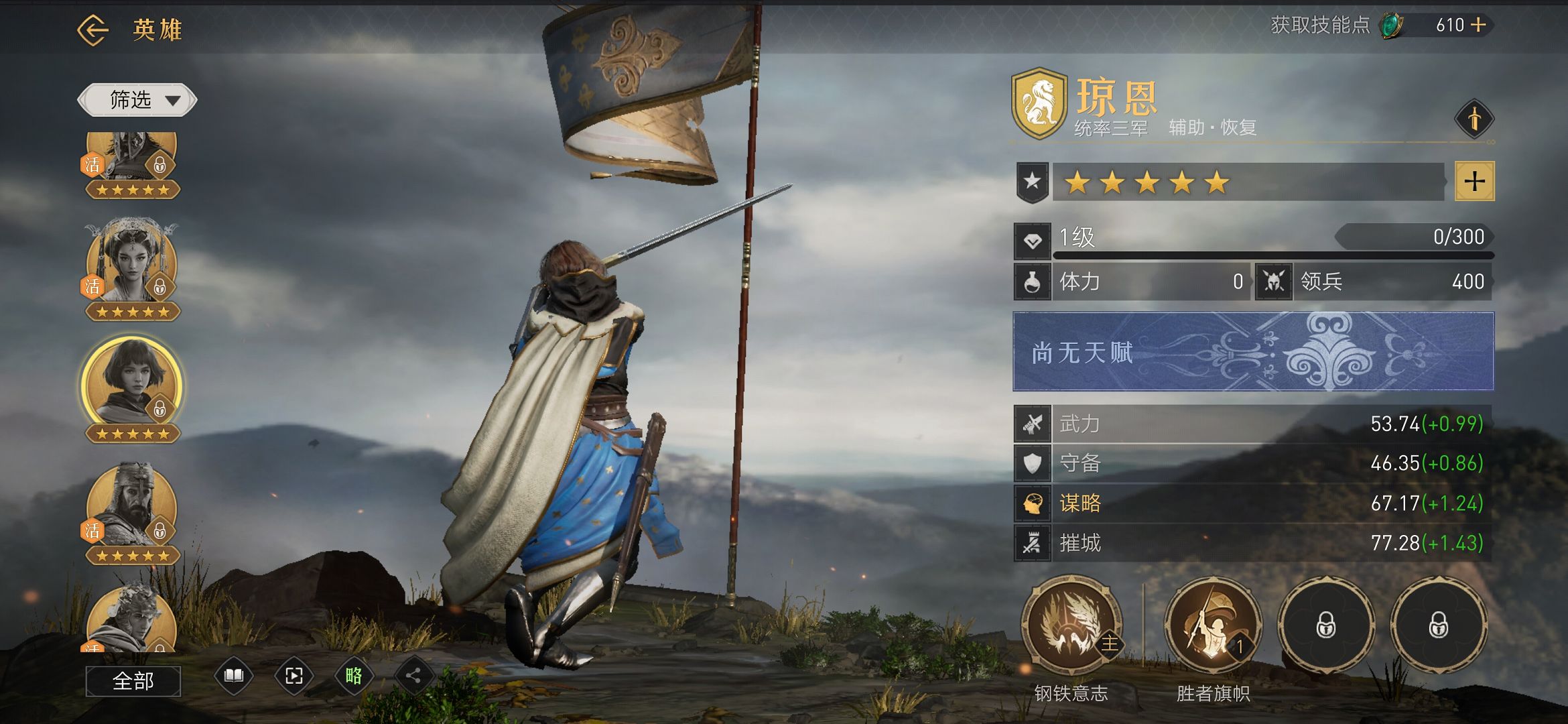 在玩家们通关第三章主线剧情之后就可以从琼恩和尤里乌斯两个英雄中选择一个,琼恩是一个偏向于辅助的角色,在战斗中可以回复我军兵力,还能减免敌方造成的普攻伤害,在游戏内是一个实打实的辅助,比较适合一些持久性战斗。