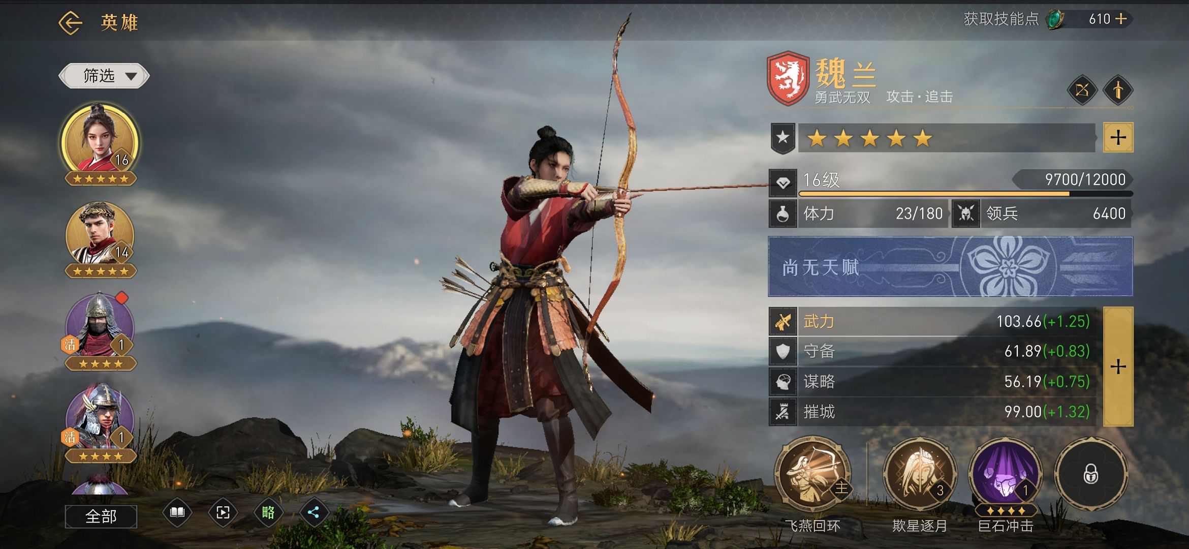 这个英雄的原型就是花木兰,在游戏中属于首次十连抽必中中的一个橙将,对于玩家们前期的开荒来说有着极强的作用。魏兰属于一个战斗输出类的武将,可以带领剑士和弓兵两个兵种,主动技能都是偏向于输出类的,攻击完敌人之后可以再次追击一次,属于前期必选。