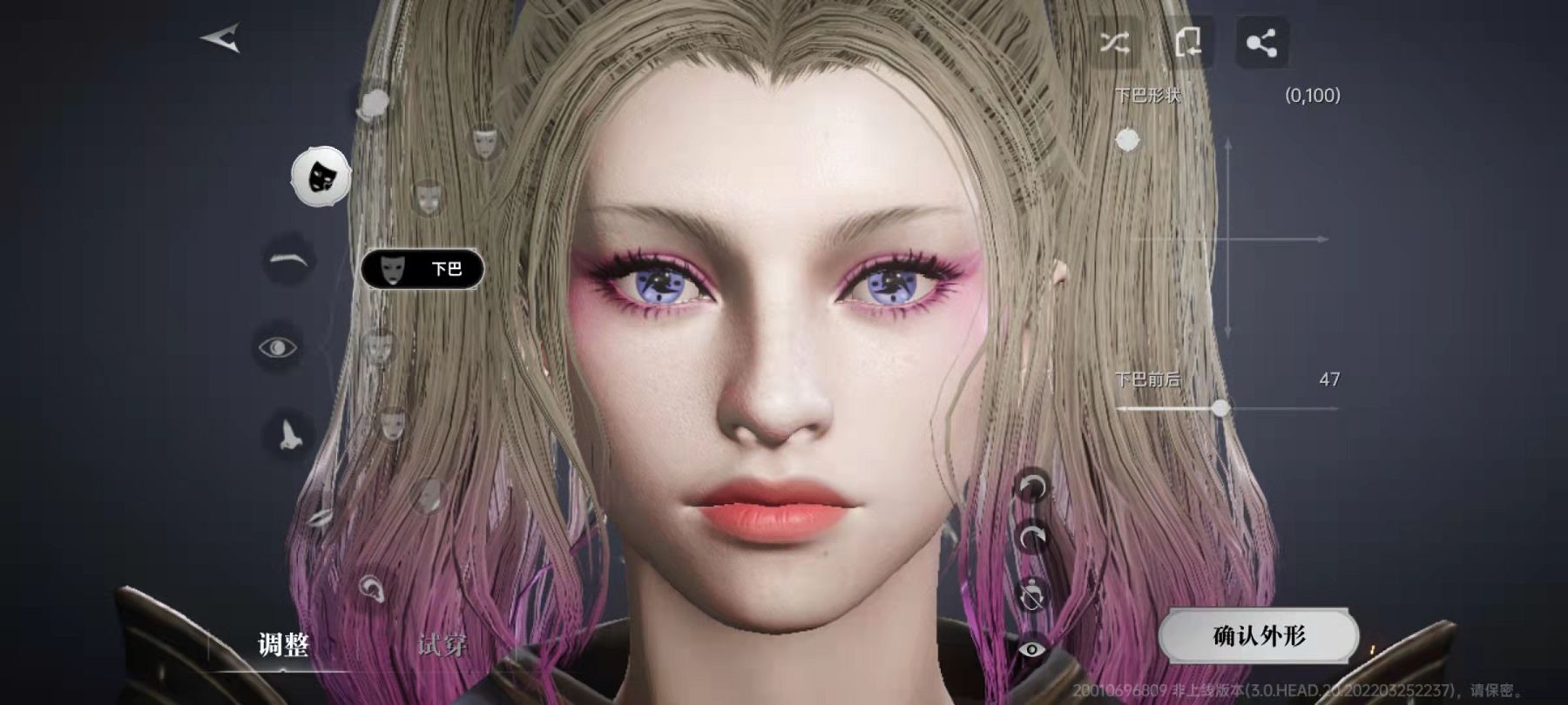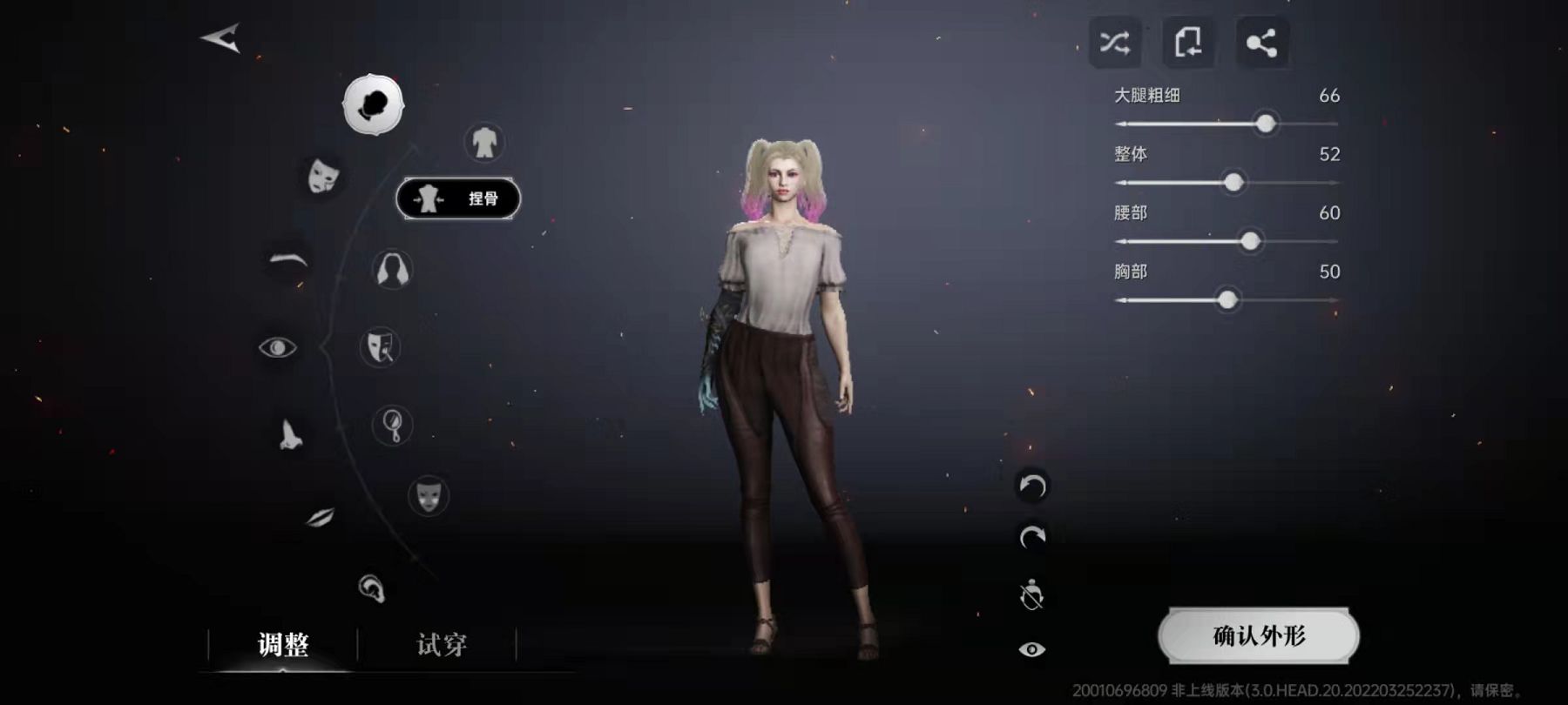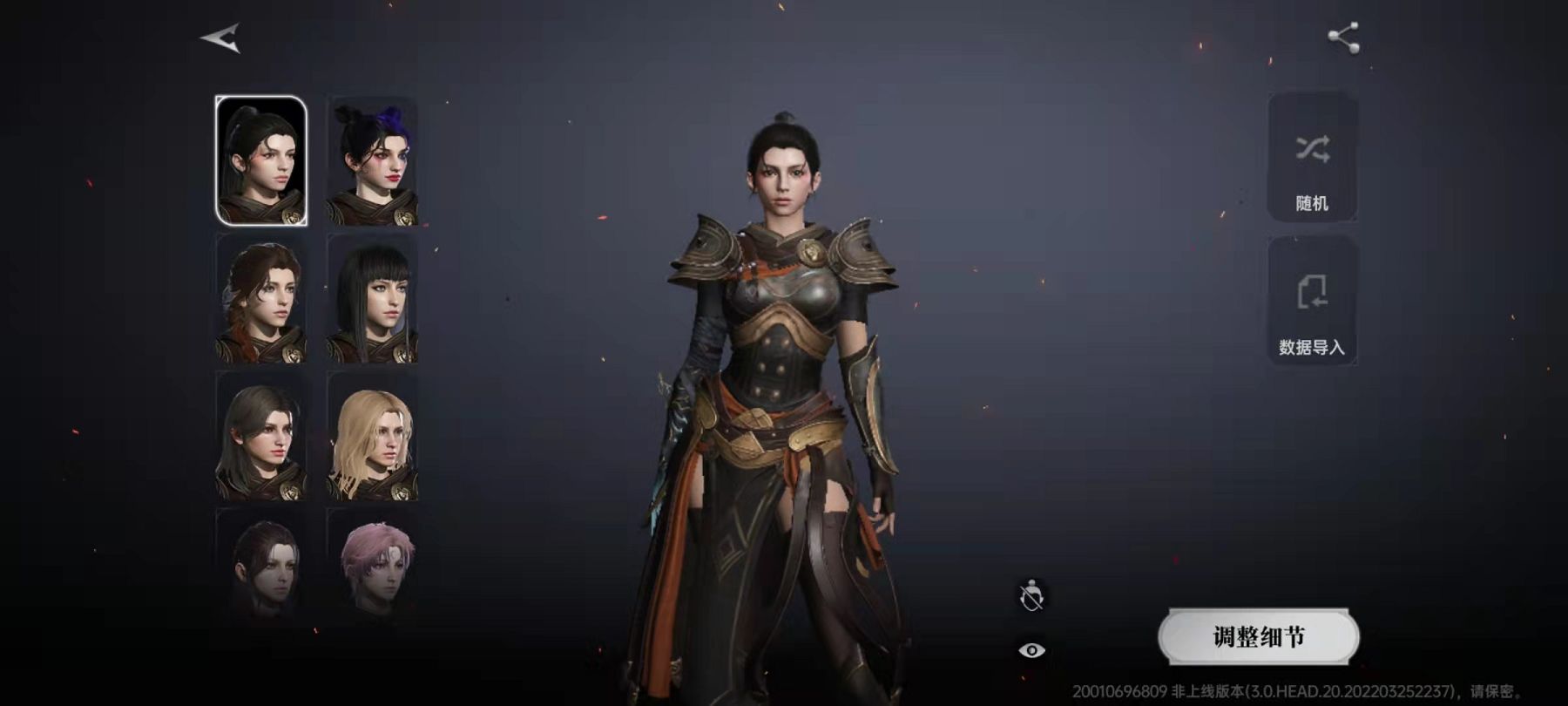 这里小编以女性角色为例来给大家讲一下如何捏脸。角色性别选好之后,会进入外观选择界面,在界面上有一个随机的选项,可以在当前角色库中随机生成一个形象,当然大家也可以自己选择。大致的形象生成好之后,再点击细节调整,这就是正式的捏脸环节。