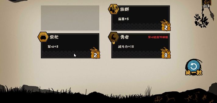 技能卡的选择比较关键,有些人可能喜欢陷阱、防御,但推荐还是移动、驻停,但前提一定要会合理地使用驻停,不然这张卡就是白费。议事和募兵方面都不是特别关键,前期就保证猥琐发育即可,一个点军心+5另一个就点扩充20%,前期兵甲数太多后期会跟不上。