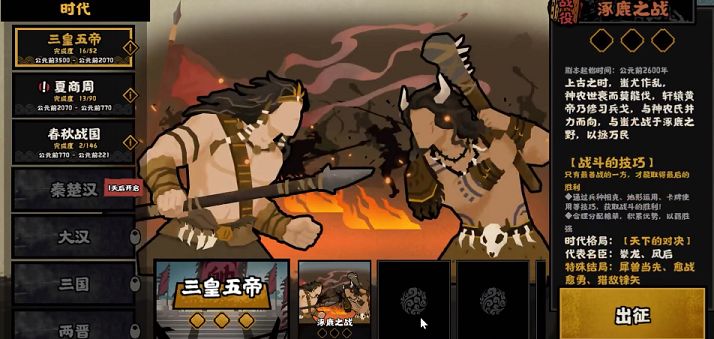 因为最后和蚩尤打的时候对方是全野兽阵容,所以在角色选择上肯定是勇士,所以路线选择太行山就刚刚好。涿鹿之战前期就是各种发育,一切都是为了最后一战,想方设法提升勇士的等级即可,一直到涿鹿之战之前都不会有什么难度,最后加加战斗力就能轻松横扫蚩尤。