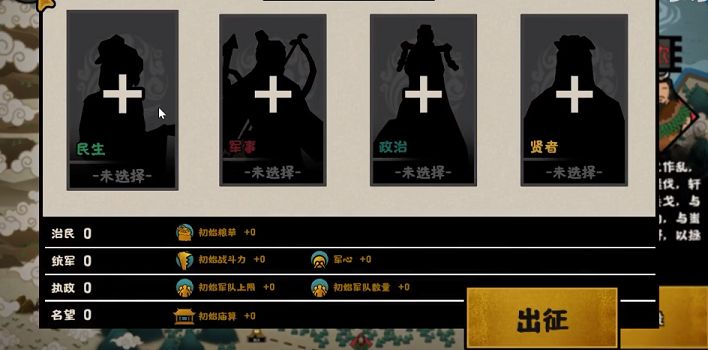 开局前的准备并不是很重要,在进入涿鹿之战之前会选择名臣,反正这里的选择就是按照高低顺序来定,有好的名臣就上,没有好的名臣就滥竽充数。第一关开启后就是一场战役,这场战役输赢都是无所谓的,因为还会有第二场重战,假设名臣等级高的话还是有赢的几率。