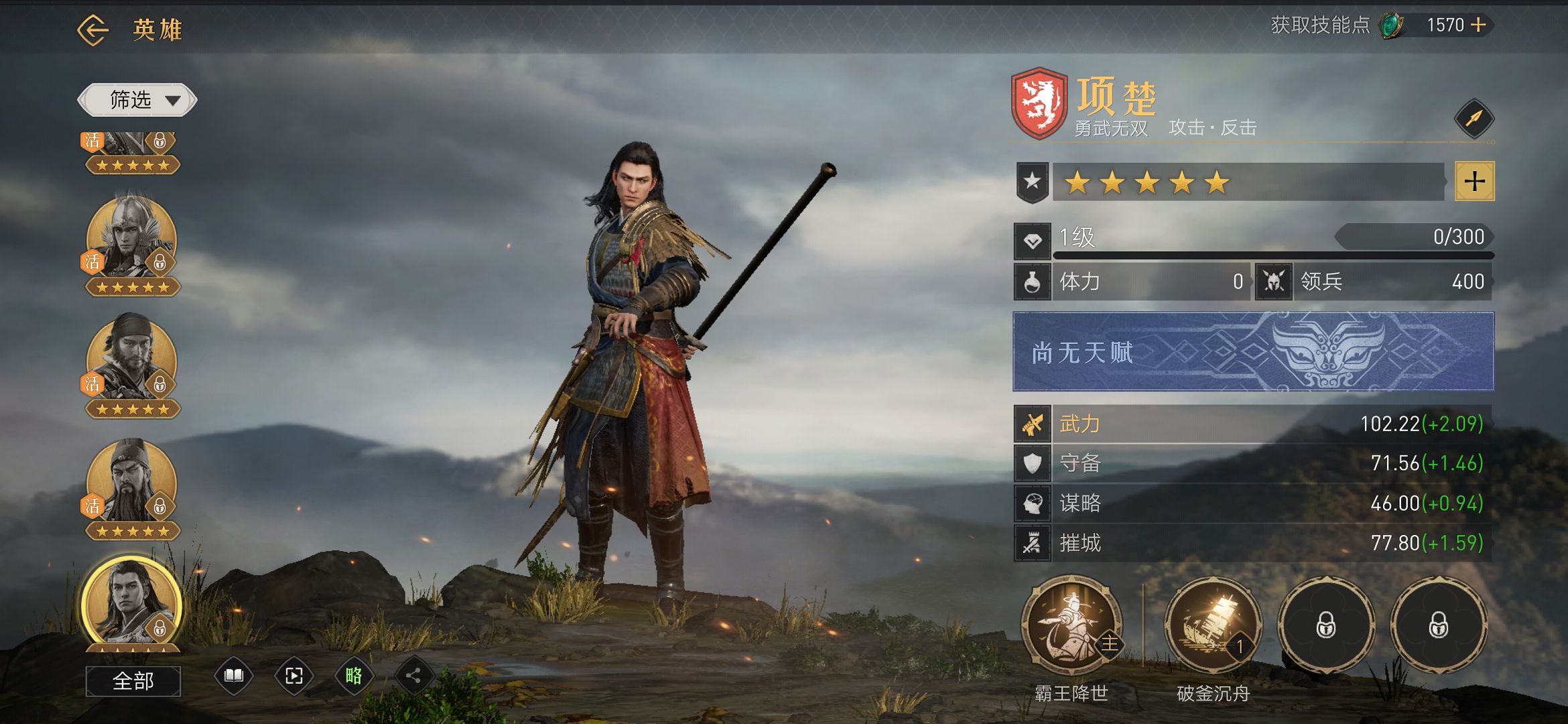反击枪阵容主要靠的是项楚的固有技能,我方每次受到普通攻击都会对敌军造成武力伤害,下降的兵力会转化为战斗力,这让这套阵容越打越强,而主动技能霸王降世则是自身已损,生命值越多伤害也就越高。
