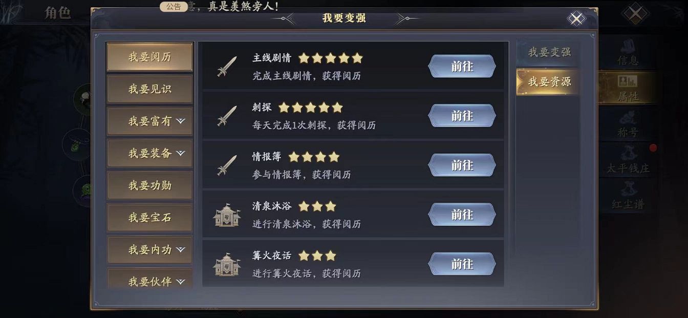 第二个就是在提升修为里面查看,点击我要提升修为,就会出现两个板块,分别是变强以及资源,不同的需求所出现的玩法板块都是不一样的,玩家可以在这里面查看对应的玩法,并且了解每一个玩法所能为玩家提供的服务。